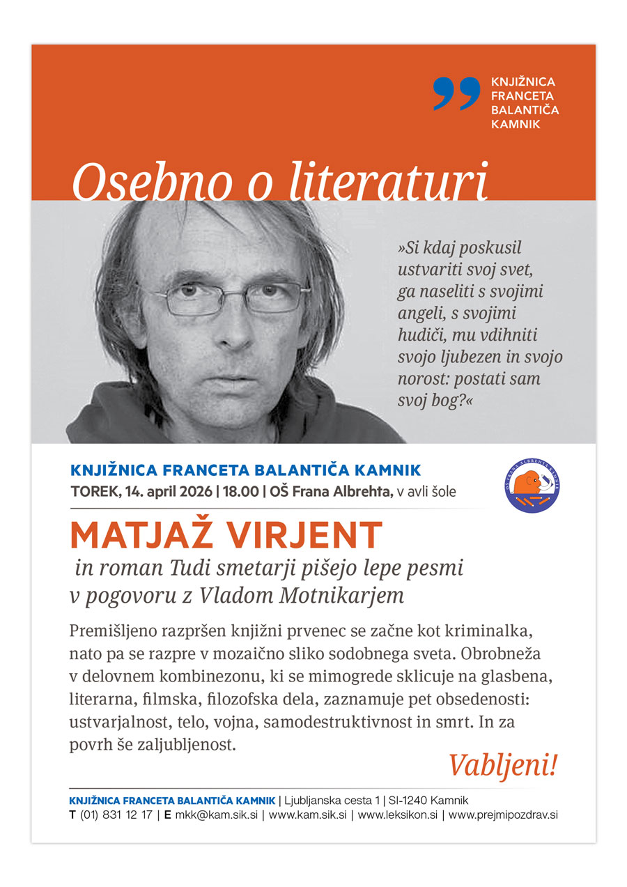 Skoči do osrednje vsebine Osebno o literaturi | Matjaž Virjent
