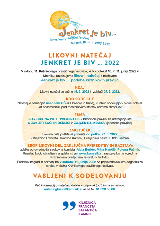 Vabimo vas k sodelovanju na likovnem natečaju Jenkret je bil 2022, ki ga Knjižnica Franceta Balantiča Kamnik že 11. leto prireja v okviru Križnikovega pravljičnega festivala. Informacije o natečaju najdete na spodnji povezavi.