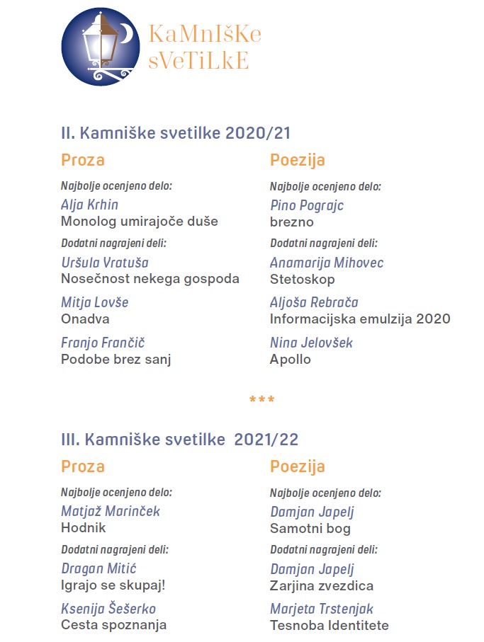 V preteklem tednu je izšel zbornik literarnih natečajev II. in III. Kamniške svetilke. Vsebuje 14 nagrajenih in izbranih avtorskih del s področja kratkih zgodb in poezije, ki jih je na literarna tečaja II. Kamniške svetilke (2020/2021) in III. Kamniške svetilke (2021/2022) prispevalo 13 avtorjev.