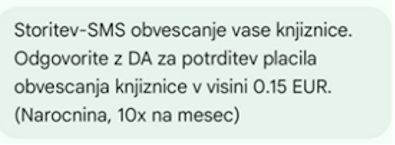 Uporabnike obveščamo, da smo seznanjeni, da so nekateri na svoje telefone z neznane številke prejeli sporočila, ki se nanašajo na plačevanje SMS obveščanja s strani knjižnice. Eno takšnih prejetih obvestil je videti takole: