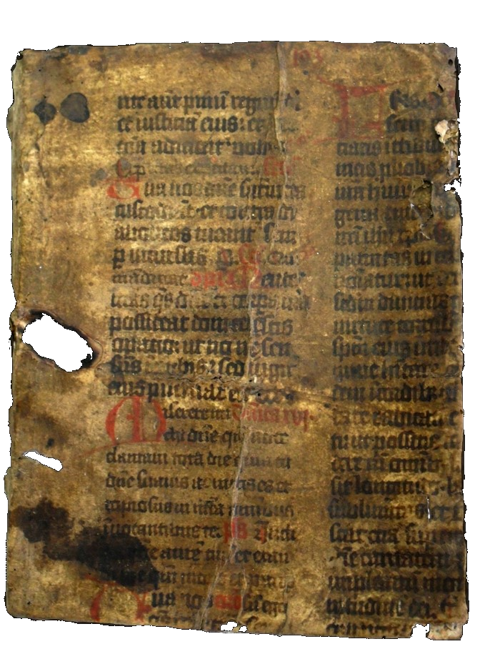 Rokopisni fragment iz poznosrednjeveške pergamentne bogoslužne knjige (14. ali 15. stoletje). V rokopis so v začetku 17. stoletja ovili platnice tiskane knjige. |
