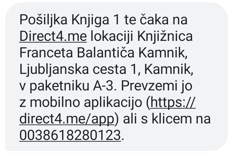 Potem, ko ste naročili želeno gradivo, ga bomo v knjižnici poiskali, izposodili na vašo izkaznico in odložili v paketnik. Ko bo naročeno gradivo v paketniku, boste prejeli SMS (Slika 1), s katerim boste obveščeni: