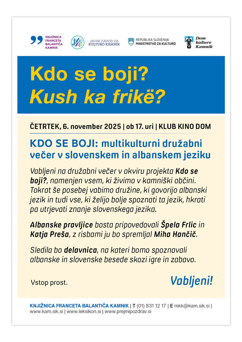 Skoči do osrednje vsebine Kdo se boji? - Kush ka frikë? | multikulturni družabni večer v slovenskem in albanskem jeziku